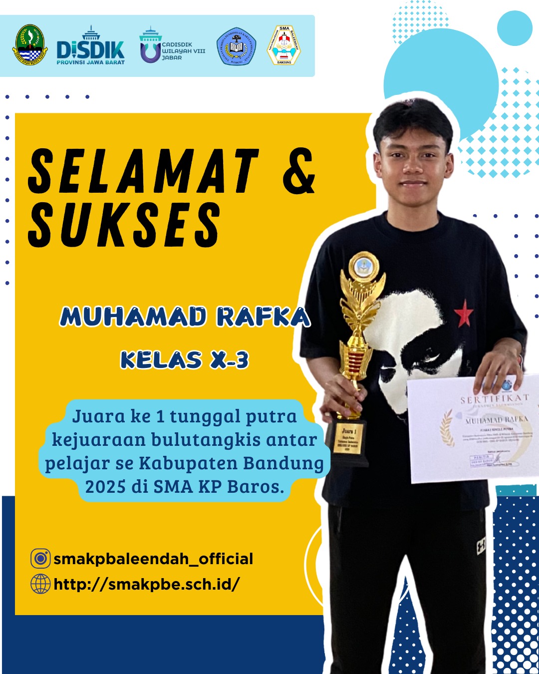 Selamat dan sukses kami ucapkan kepada Muhamad Rafka, siswa kelas X-3 SMA KP Baleendah, atas prestasinya yang gemilang! Ia berhasil meraih Juara 1 Tunggal Putra dalam Kejuaraan Bulutangkis Antar Pelajar se-Kabupaten Bandung 2025.