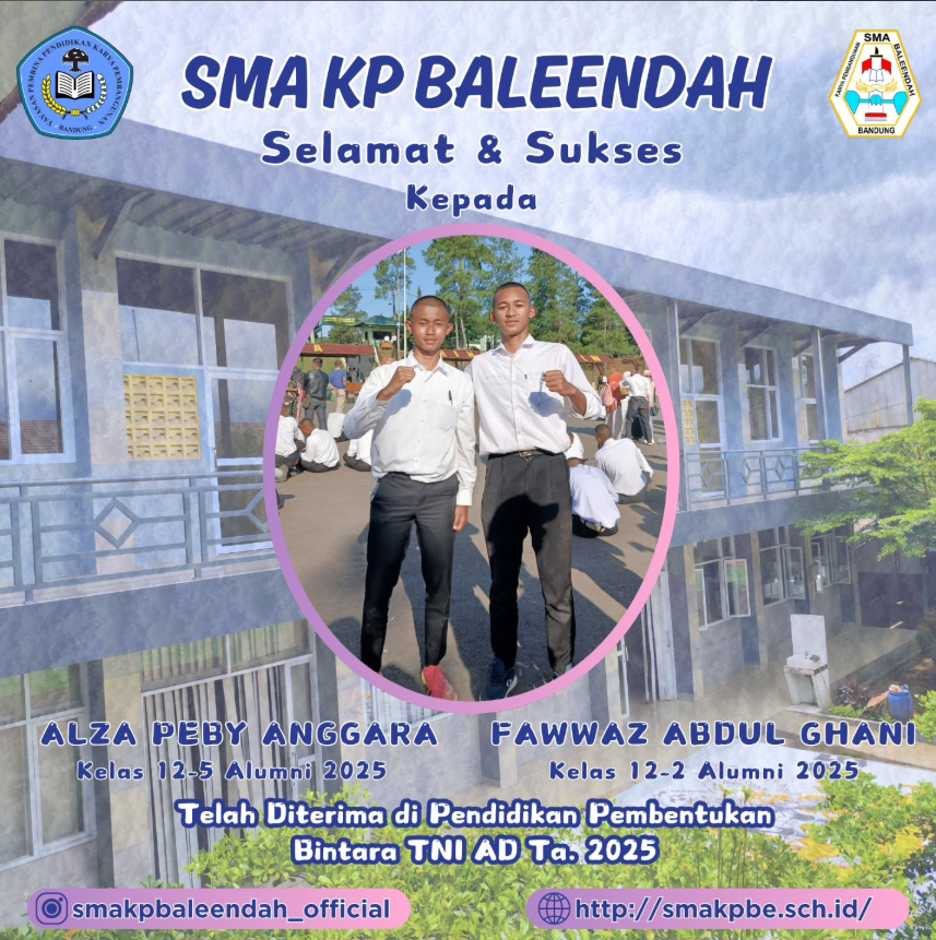 Segenap keluarga besar SMA KP Baleendah dengan penuh kebanggaan dan suka cita mengucapkan selamat serta sukses sebesar-besarnya kepada Alza Pebby Anggara dari Kelas 12-5 dan Fawwaz Abdul Ghani dari Kelas 12-2, alumni tahun 2025, yang telah berhasil diterima di Pendidikan Pembentukan Bintara TNI AD Tahun Ajaran 2025!