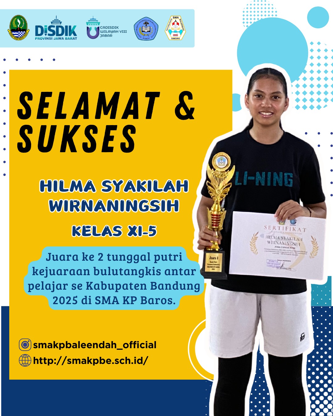 Kami mengucapkan selamat dan apresiasi yang setinggi-tingginya kepada Hilma Syakilah Wirnaningsih, siswi kelas XI-5 SMA KP Baleendah. Ia berhasil meraih Juara 2 Tunggal Putri dalam Kejuaraan Bulutangkis Antar Pelajar se-Kabupaten Bandung 2025 yang diselenggarakan di SMA KP Baros.