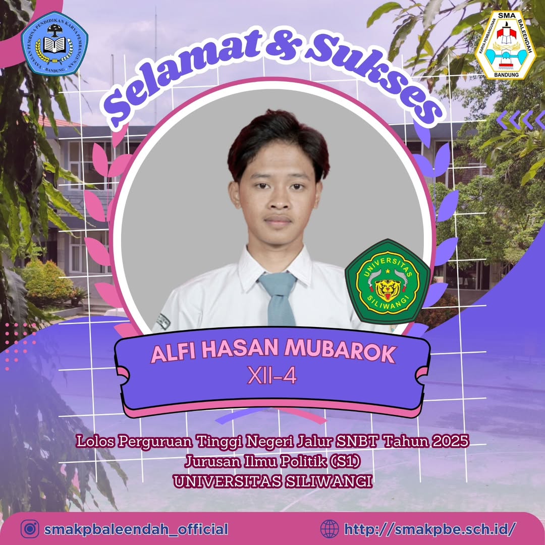 Kami, segenap keluarga besar SMA KP Baleendah, mengucapkan selamat dan sukses yang sebesar-besarnya kepada Ananda Alfi Hasan Mubarok. Selamat menempuh jenjang pendidikan yang lebih tinggi, semoga ilmu yang didapat bermanfaat, dan teruslah berkarya untuk menjadi kebanggaan keluarga, almamater, serta bangsa.