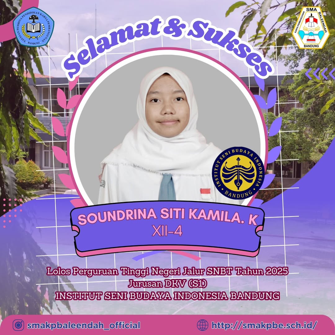 Kami, segenap keluarga besar SMA KP Baleendah, mengucapkan selamat dan sukses yang setinggi-tingginya kepada Ananda Soundrina Siti Kamila Kartabrata. Selamat menempuh babak baru dalam perjalanan akademismu di PTN. Semoga ilmu yang didapat bermanfaat, dan teruslah menjadi pribadi yang berprestasi serta memberikan kontribusi positif bagi masyarakat, bangsa, dan negara.