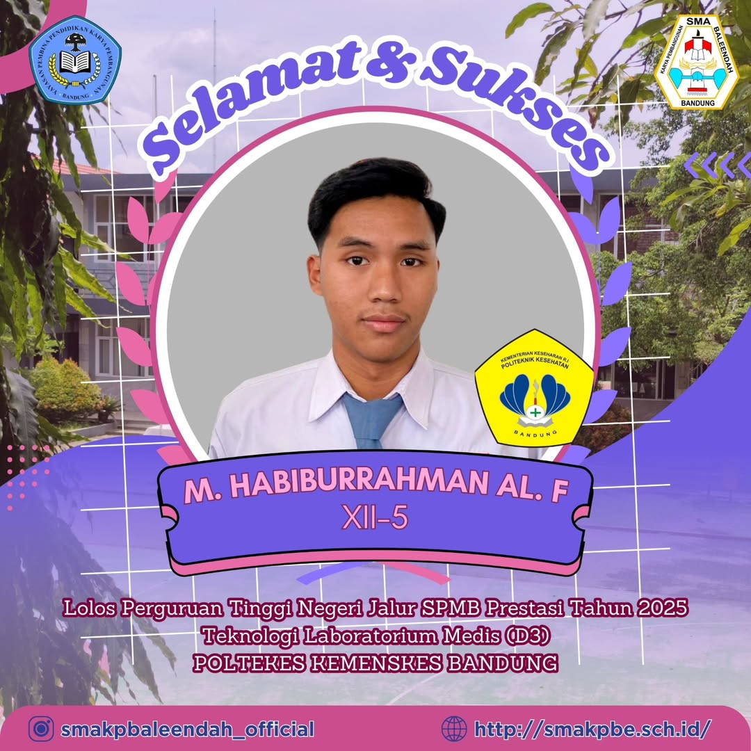 Kami segenap keluarga besar SMA KP Baleendah mengucapkan selamat dan sukses sebesar-besarnya kepada Ananda M. Habiburrahman Al Farizi. Semoga perjalananmu di bangku perkuliahan berjalan lancar, penuh ilmu, dan membawa manfaat bagi bangsa dan negara. Teruslah berkarya dan menjadi inspirasi bagi banyak orang!