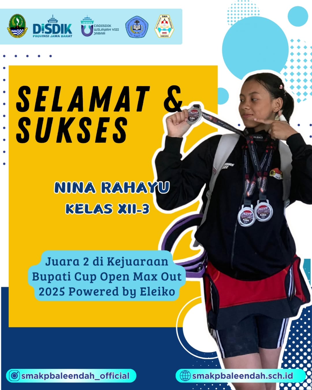 Kami dengan bangga mengucapkan selamat kepada siswi hebat kita, Nina Rahayu dari kelas XII-3, yang telah berhasil meraih Juara ke-2 dalam kejuaraan bergengsi Angkat Besi Bupati Cup Open Max Out 2025 Powered by Eleiko.